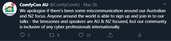 We created ComfyCon AU not as a replacement, but an integrated part of the cyber community and the cyber conferences within Australia and New Zealand. And to be honest, if we went away after the in-person conferences could be held again, we were totally fine with that.